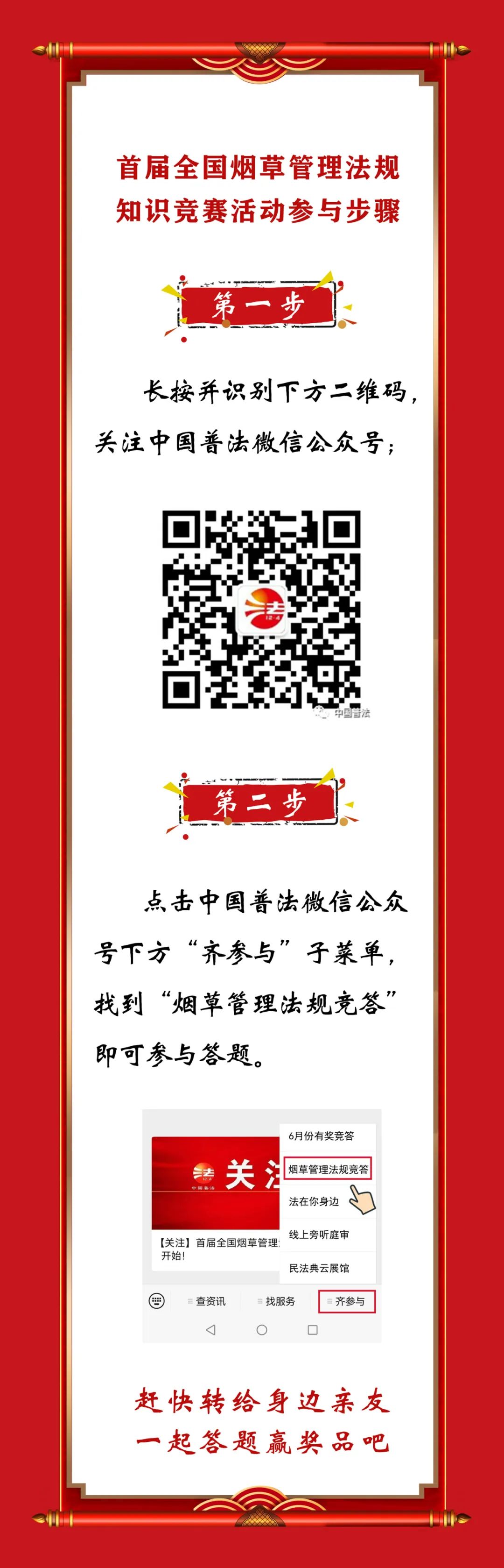 关注“中国普法”微信公众号,点击公众号右下角子菜单“齐参与”—“烟草管理法规竞答”即可参与答题。